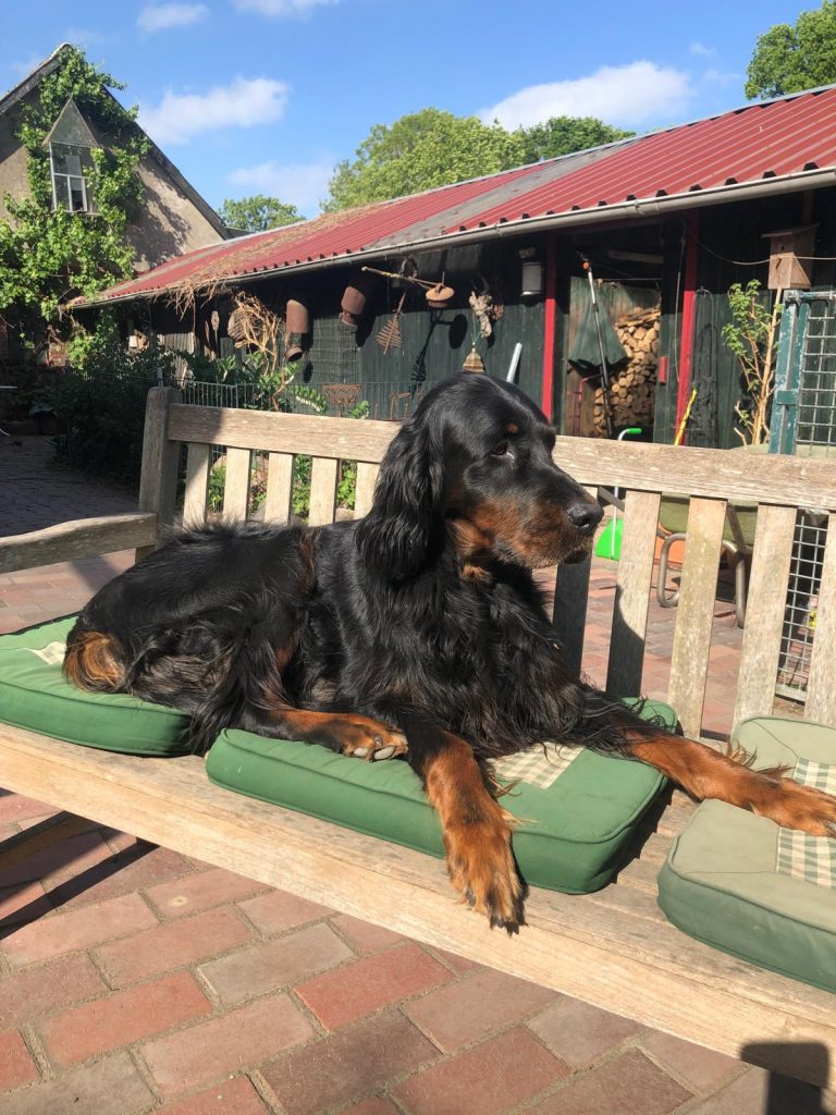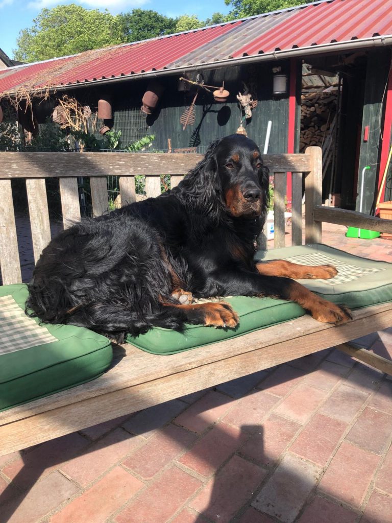 5 Jahre vergehen so schnell! Aus Sarah ist eine zuverlässiger , passionierte Jagdhündin geworden, die gerne von der Bank aus ihr Gartenreich überblickt.